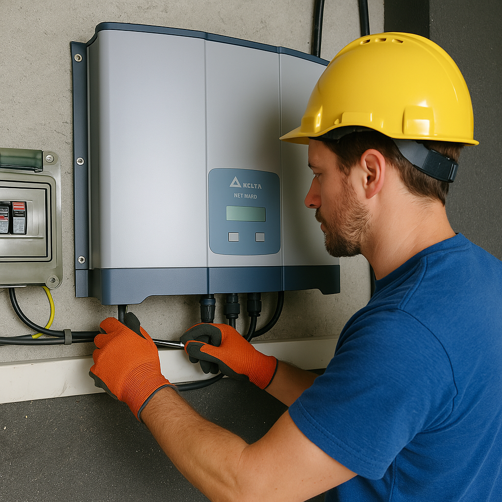 Faire appel à nos services, c'est l'assurance d'une intervention sécurisée par un professionnel équipé (casque, gants isolants, outillage spécialisé). Comme illustré sur nos photos de chantiers réels, nous intervenons sur tous types d'onduleurs et de tableaux électriques, garantissant une installation propre et conforme aux normes en vigueur. Nous vous remettons un rapport détaillé des mesures effectuées pour votre suivi personnel ou votre assurance.